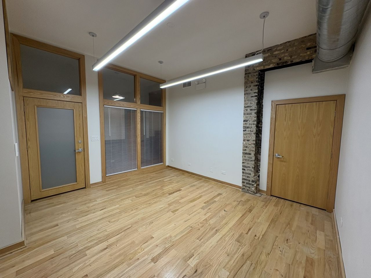 This 210-square-foot private office space is located on the first floor of a vintage building that is tastefully designed with hardwood floors, floor-to-ceiling glass, frame partitions, exposed brick, contemporary lighting, and other thoughtful details. The unit is one of four suites that share a kitchenette and bathroom. Each unit is equipped with its dedicated intercom system, providing 24/7 access. Tenants are responsible for their pro rata share of gas and electricity for heating and cooling.
